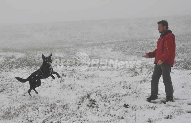 写真は、ビクトリア州マウントホッサム(Mount Hotham)で季節外れの雪に喜ぶイヌと飼い主の男性(2010年12月19日撮影)。(c)AFP/Gina WOODWARD