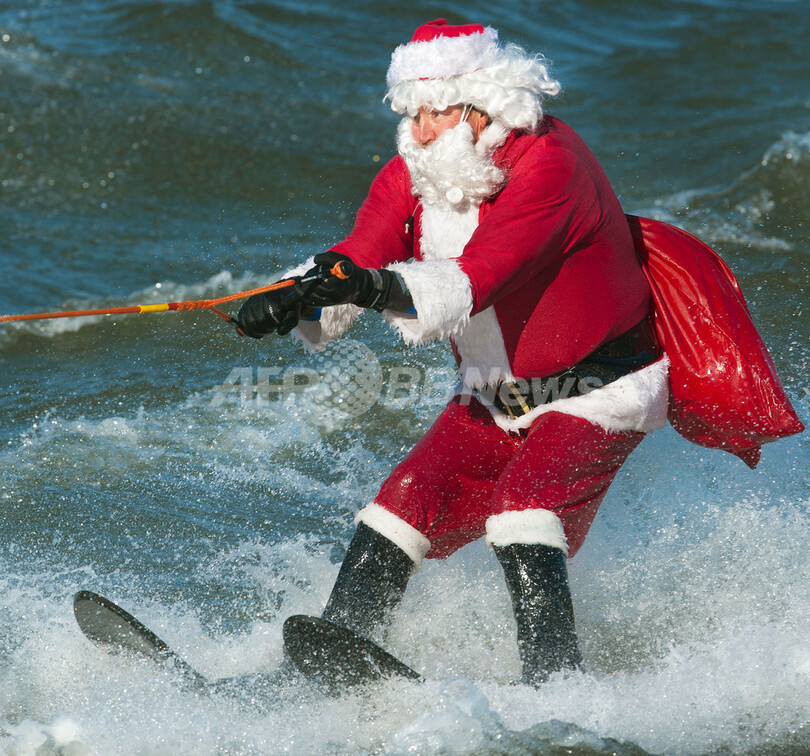 写真はポトマック川(Potomac River)で、水上スキーをするサンタクロース(2010年12月24日撮影)。(c)AFP/Paul J. Richards