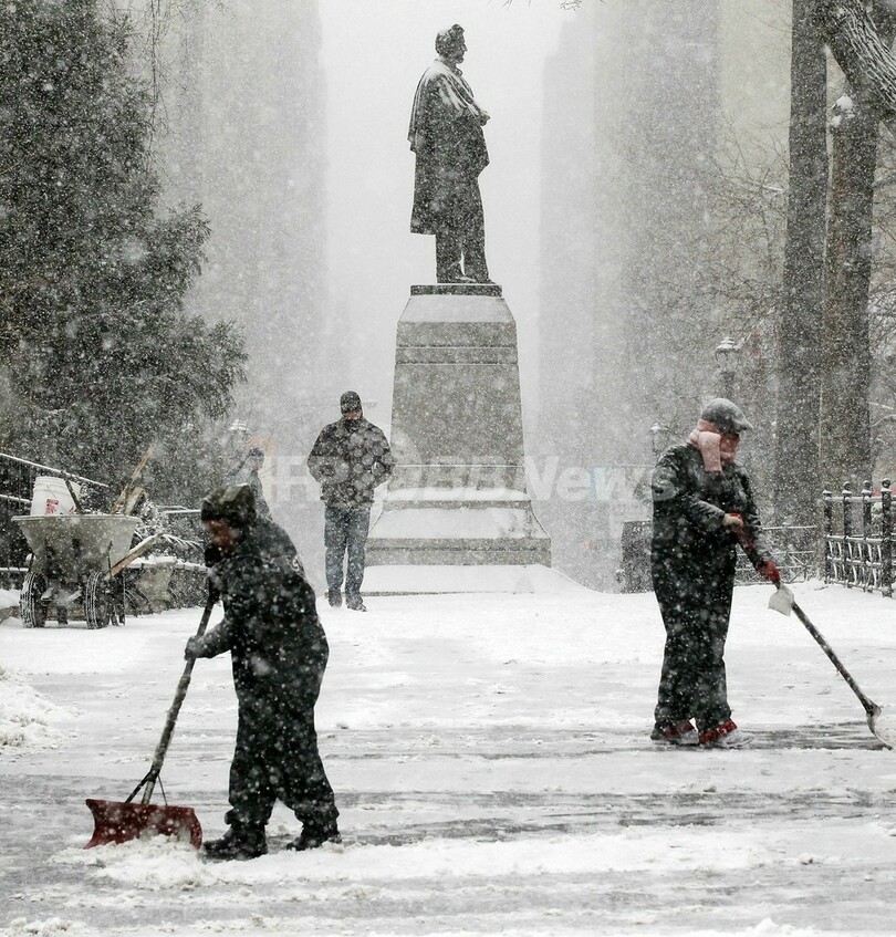 写真はニューヨーク(New York)マンハッタン(Manhattan)のユニオンスクエア(Union Square)で、除雪作業にあたる人びと(2010年12月26日撮影)。(c)AFP/Getty Images/Mario Tama