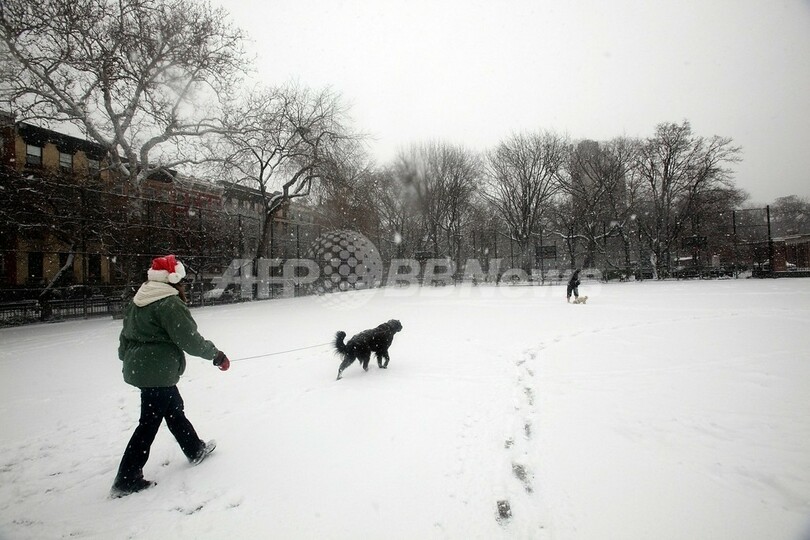 写真はニューヨーク(New York)マンハッタン(Manhattan)で、雪が積もったトンプキンス・スクエア・パーク(Tompkins Square Park)でイヌを散歩させる女性(2010年12月26日撮影)。(c)AFP/Getty Images/Mario Tama