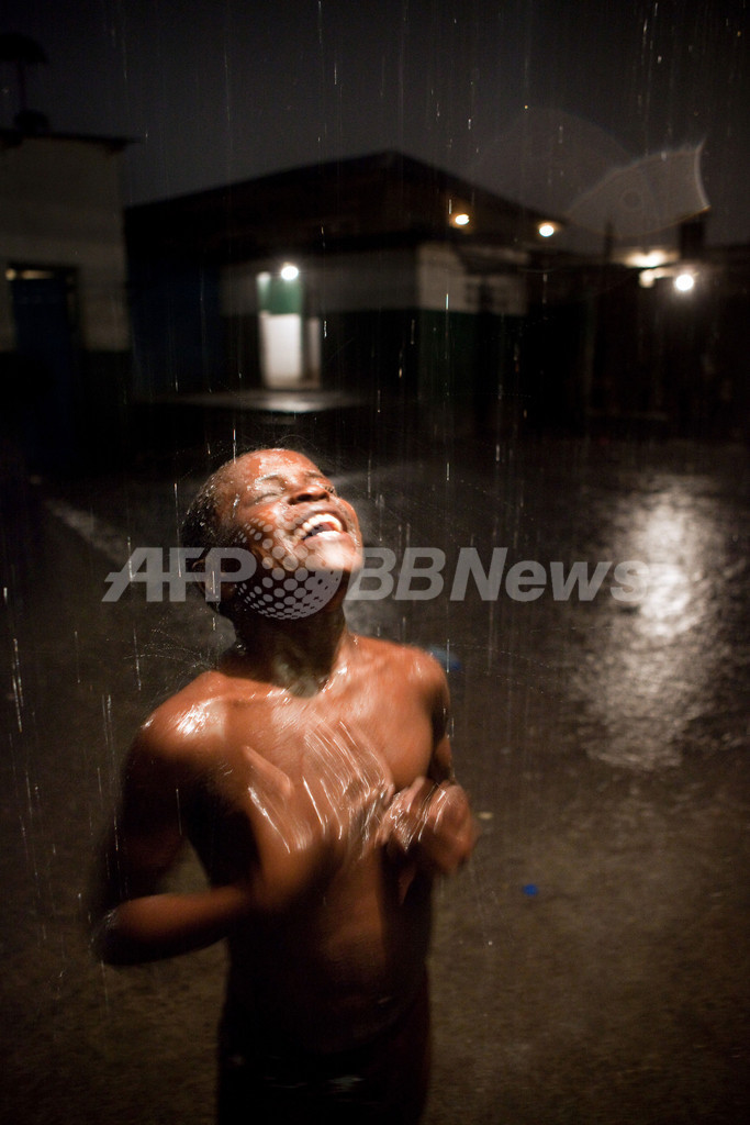 写真は、キンシャサにあるストリートチルドレンのための「オープンセンター」でパフォーマンスをして生活費を稼ぐストリートチルドレンの少年。路上生活する子どもたちはオープンセンターで夜を過ごすことができる。ここで水は利用できるが、食事や医療、教育は与えられない(2010年11月6日撮影)。(c)AFP/GWENN DUBOURTHOUMIEU