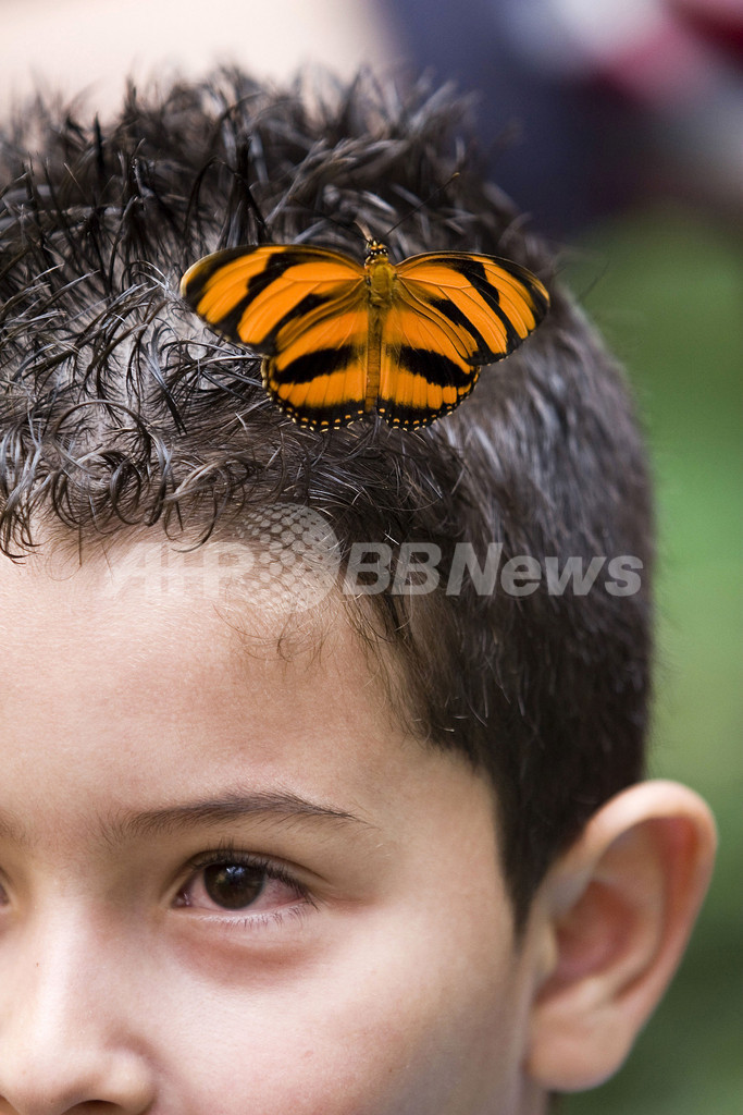 写真は、少年の頭にとまったオビモンドクチョウ(2010年12月29日撮影)。(c)AFP/Fredy Amariles