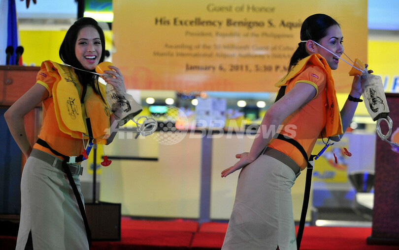 【1月7日 AFP】「踊る客室乗務員」で話題を呼んだフィリピンの格安航空会社セブ・パシフィック航空(Cebu Pacific)の乗客数が6日、5000万人を突破した。5000万人目の乗客には、記念品として、同航空の16の国際線と33の国内線のフライトに1年間乗り放題の航空券がプレゼントされた。(c)AFP