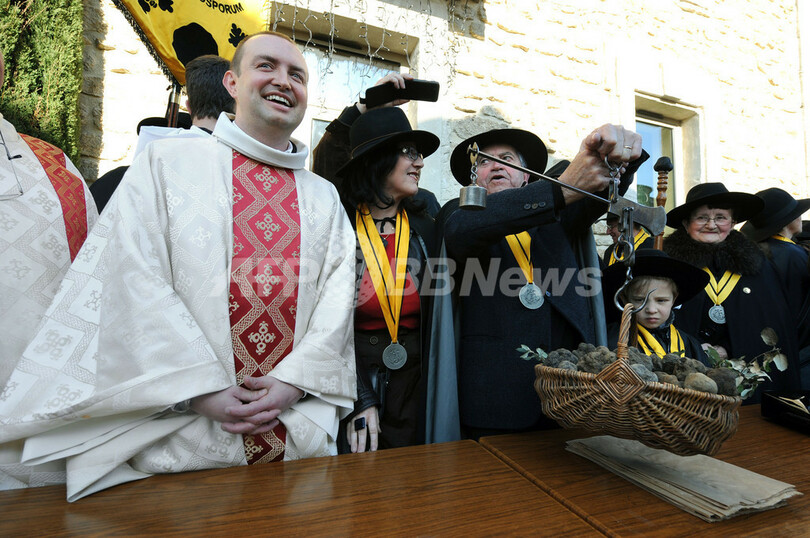 【1月17日 AFP】フランス南西部のRicherenchesで16日、毎年1月第3週の日曜日に開催される「トリュフミサ」が行われた。トリュフミサでは、お金の代わりにトリュフを寄贈するのが恒例となっている。寄贈されたトリュフは、「美食の黒ダイヤ(Black Diamond of Gastronomy)」メンバーらが、市庁舎前広場でオークションにかける。(c)AFP