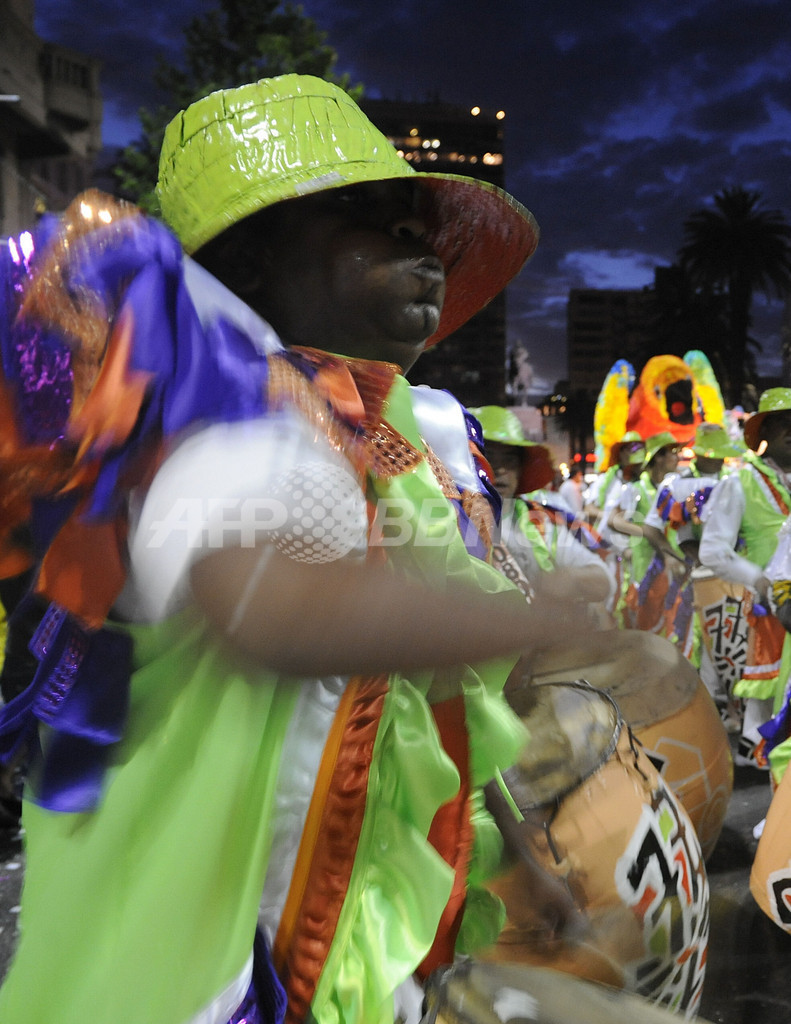 南米ウルグアイの首都モンテビデオ(Montevideo)で27日、毎年恒例のカーニバルが開幕した。世界でもっとも長期間開催されるカーニバルのひとつで、1月末に始まり、なんと3月初旬まで続く(2011年1月27日撮影)。(c)AFP/Miguel ROJO