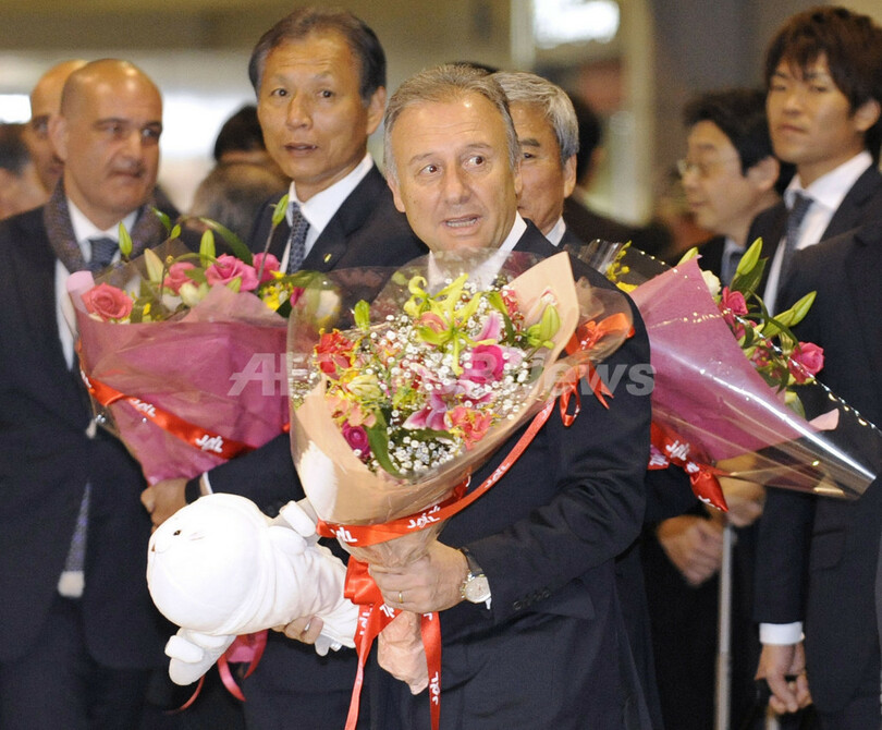写真は31日、ドーハから日本に戻り、成田空港(Narita International Airport)で花束を受け取ったサッカー日本代表のアルベルト・ザッケローニ(Alberto Zaccheroni)監督(2011年1月31日撮影)。(c)AFP/KAZUHIRO NOGI