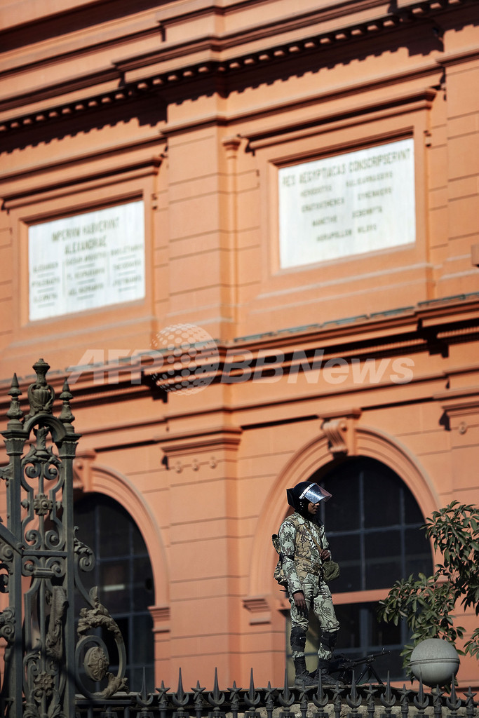貴重な古代の美術品を数多く収蔵する同博物館の周囲には、翌29日から市民らが自発的に「人間の鎖」を作って、略奪者の侵入を防いでいる。市民らに略奪者から国と自分たちを守ろうと呼びかけたのは軍で、同博物館も30日から軍の戦車に守られている。一般公開は中止されている。(c)AFP