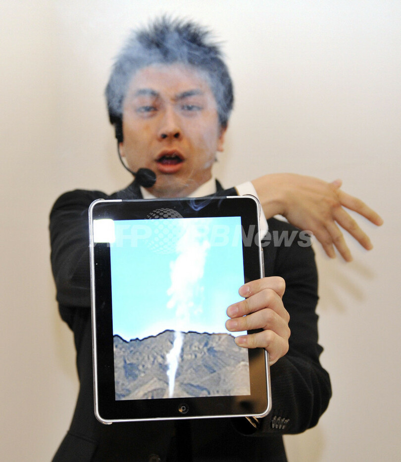 都内・国立新美術館(National Arts Center)で開催中の第14回文化庁メディア芸術祭(Japan Media Arts Festival)で、マジシャンの内田伸哉(Shinya Uchida)さんが、タブレット型端末iPadを使ったマジックショー「iPad magic」を披露した。内田さんはメディア芸術祭のエンターテインメント部門、奨励賞を獲得した(2011年2月1日撮影)。(c)AFP/Yoshikazu TSUNO