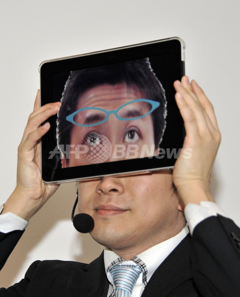 都内・国立新美術館(National Arts Center)で開催中の第14回文化庁メディア芸術祭(Japan Media Arts Festival)で、マジシャンの内田伸哉(Shinya Uchida)さんが、タブレット型端末iPadを使ったマジックショー「iPad magic」を披露した。内田さんはメディア芸術祭のエンターテインメント部門、奨励賞を獲得した(2011年2月1日撮影)。(c)AFP/Yoshikazu TSUNO