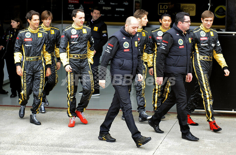 写真は、R31を披露するドライバーのロベルト・クビサ(Robert Kubica、ポーランド、左から3人目)とチームオーナーのジェラルド・ロペス(Gerard Lopez)氏(中央)、ビタリー・ペトロフ(Vitaly Petrov、ロシア、右、2011年1月31日撮影)。(c)AFP/JOSE JORDAN
