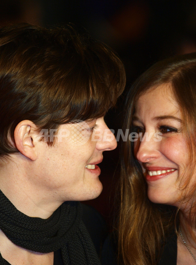 英ロンドン(London)のレスタースクエア(Leicester Square)で1日、サム・ライリー(Sam Riley)やヘレン・ミレン(Helen Mirren)らが出演する映画『ブライトン・ロック(Brighton Rock)』の欧州プレミアが行われた。写真は、レッドカーペットに登場したサム・ライリー(左)と妻で女優のアレクサンドラ・マリア・ララ(Alexandra Maria Lara、2011年2月1日撮影)。(c)AFP/MAX NASH