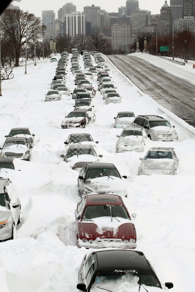 米イリノイ(Illinois)州シカゴ(Chicago)のレークショアドライブ(Lake Shore Drive)で、事故に伴う渋滞で停止したまま雪に埋もれ、運転手たちに放置された車の列。米国では、南部~東部の広範囲で、過去数十年で最も荒れた暴風雪に見舞われている。シカゴでは2日朝までに約50センチと観測史上3番目の積雪を記録した(2011年2月2日撮影)。(c)AFP/Getty Images/Scott Olson