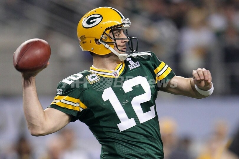 パッカーズのクォーターバック(QB)、アーロン・ロジャース(Aaron Rodgers)は第4クオーターにグレッグ・ジェニングス(Greg Jennings)への8ヤードのタッチダウンパスを通すなど3本のタッチダウンパスを通し、最優秀選手(MVP)に選ばれた。(c)AFP