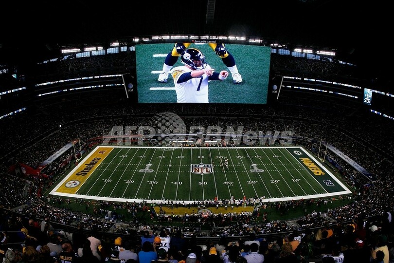写真は、カウボーイ・スタジアムのスクリーンに映し出されたピッツバーグ・スティーラーズの選手(2011年2月6日撮影)。(c)AFP/Getty Images/Tom Pennington