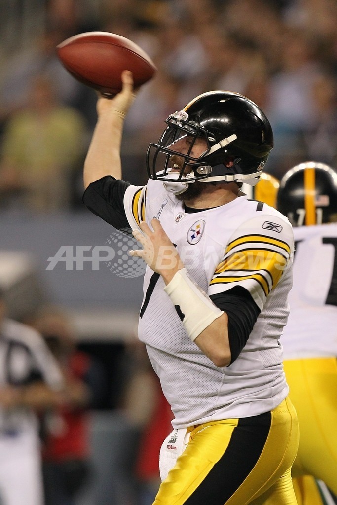 写真は、パスを出すスティーラーズのベン・ロスリスバーガー(Ben Roethlisberger)。(2011年2月6日撮影)。(c)AFP/Getty Images/ Al Bello