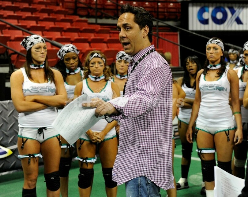 米ネバダ(Nevada)州ラスベガス(Las Vegas)で6日、下着姿の女性がアメリカンフットボールをするランジェリーフットボールリーグ(Lingerie Football League)の優勝決定戦「第8回ランジェリー・ボウル(Lingerie Bowl)」が開催された。ロサンゼルス・テンプテーョン(Los Angeles Temptation)がフィラデルフィア・パッション(Philadelphia Passion)を26-25で下し、優勝した。写真は、試合前のパッションの選手たちに話をするリーグのミッチ・モルタザ(Mitchell Mortaza)会長(2011年2月6日撮影)。(c)AFP/Getty Images/Ethan Miller