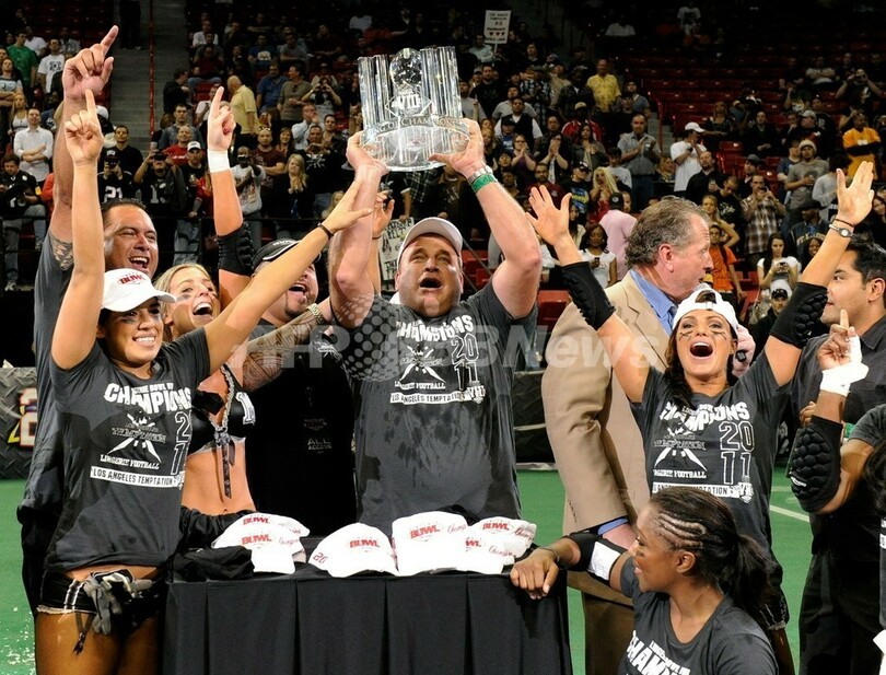 米ネバダ(Nevada)州ラスベガス(Las Vegas)で6日、下着姿の女性がアメリカンフットボールをするランジェリーフットボールリーグ(Lingerie Football League)の優勝決定戦「第8回ランジェリー・ボウル(Lingerie Bowl)」が開催された。ロサンゼルス・テンプテーョン(Los Angeles Temptation)がフィラデルフィア・パッション(Philadelphia Passion)を26-25で下し、優勝した。写真は、優勝トロフィーを掲げるテンプテーションのデービッド・ビザブ(David Bizub)監督(2011年2月6日撮影)。(c)AFP/Getty Images/Ethan Miller
