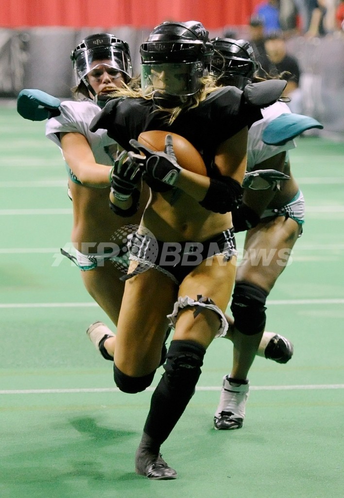 米ネバダ(Nevada)州ラスベガス(Las Vegas)で6日、下着姿の女性がアメリカンフットボールをするランジェリーフットボールリーグ(Lingerie Football League)の優勝決定戦「第8回ランジェリー・ボウル(Lingerie Bowl)」が開催された。ロサンゼルス・テンプテーョン(Los Angeles Temptation)がフィラデルフィア・パッション(Philadelphia Passion)を26-25で下し、優勝した。写真は、試合の一場面(2011年2月6日撮影)。(c)AFP/Getty Images/Ethan Miller