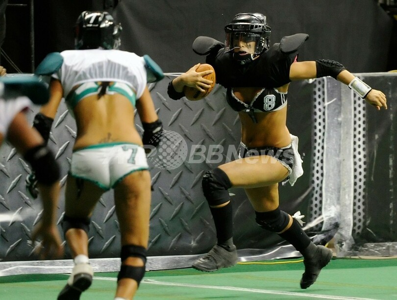 米ネバダ(Nevada)州ラスベガス(Las Vegas)で6日、下着姿の女性がアメリカンフットボールをするランジェリーフットボールリーグ(Lingerie Football League)の優勝決定戦「第8回ランジェリー・ボウル(Lingerie Bowl)」が開催された。ロサンゼルス・テンプテーョン(Los Angeles Temptation)がフィラデルフィア・パッション(Philadelphia Passion)を26-25で下し、優勝した。写真は、試合の一場面(2011年2月6日撮影)。(c)AFP/Getty Images/Ethan Miller