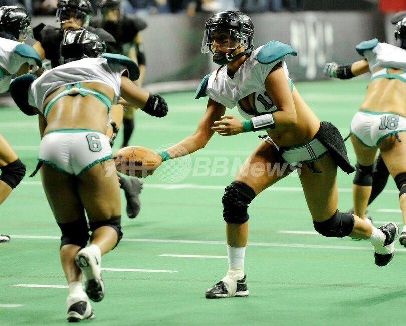 米ネバダ(Nevada)州ラスベガス(Las Vegas)で6日、下着姿の女性がアメリカンフットボールをするランジェリーフットボールリーグ(Lingerie Football League)の優勝決定戦「第8回ランジェリー・ボウル(Lingerie Bowl)」が開催された。ロサンゼルス・テンプテーョン(Los Angeles Temptation)がフィラデルフィア・パッション(Philadelphia Passion)を26-25で下し、優勝した。写真は、試合の一場面(2011年2月6日撮影)。(c)AFP/Getty Images/Ethan Miller