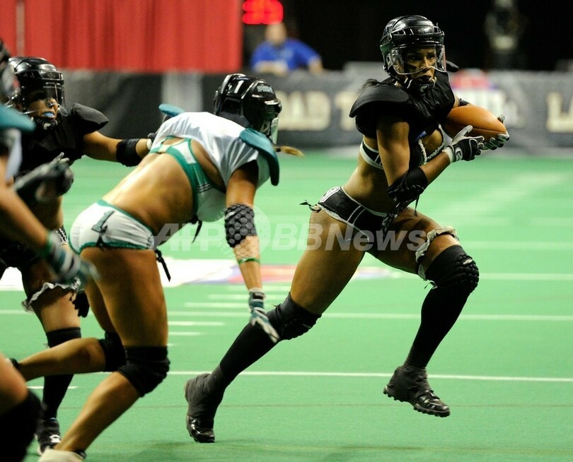 米ネバダ(Nevada)州ラスベガス(Las Vegas)で6日、下着姿の女性がアメリカンフットボールをするランジェリーフットボールリーグ(Lingerie Football League)の優勝決定戦「第8回ランジェリー・ボウル(Lingerie Bowl)」が開催された。ロサンゼルス・テンプテーョン(Los Angeles Temptation)がフィラデルフィア・パッション(Philadelphia Passion)を26-25で下し、優勝した。写真は、試合の一場面(2011年2月6日撮影)。(c)AFP/Getty Images/Ethan Miller