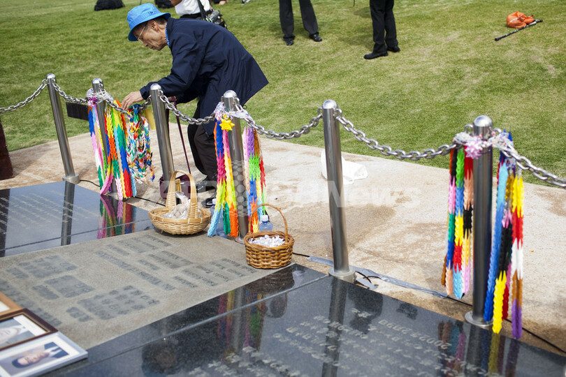 写真は、ハワイ・ホノルル市のカカアコ・ウオーターフロント公園にある「えひめ丸慰霊碑」に飾られた千羽鶴に触れる遺族(2011年2月9日撮影)。(c)AFP/Kent Nishimura