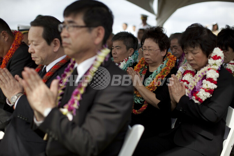 写真は、ハワイ・ホノルル市のカカアコ・ウオーターフロント公園にある「えひめ丸慰霊碑」で営まれた追悼式で手を合わせる参列者ら(2011年2月9日撮影)。(c)AFP/Kent Nishimura