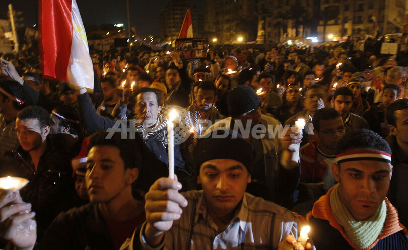 タハリール広場に集まっている反政府デモの参加者らは解散するそぶりを見せていない。カイロ(Cairo)中心部のタハリール広場(Tahrir Square)では、デモ開始以来最大規模となった8日に続き、9日も多数の市民が議事堂に向かって行進した。デモは国内全土に広がっている。