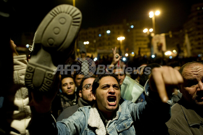【2月11日 AFP】(写真追加)エジプトのホスニ・ムバラク(Hosni Mubarak)大統領は10日夜、国営テレビで演説し、権限をオマル・スレイマン(Omar Suleiman)副大統領に委譲すると発表したが、9月の総選挙までは辞任しない意向を示した。首都カイロ(Cairo)のタハリール広場(Tahrir Square)でムバラク大統領の演説に耳を傾けていた数10万のデモ隊からは、次々と怒りの声が上がった。(c)AFP