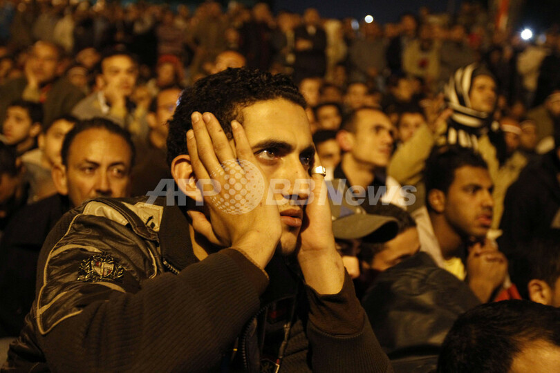 写真は、ムバラク大統領の演説を聞きながら、ぼうぜんとするデモ参加者(2011年2月10日撮影)。(c)AFP/MOHAMMED ABED