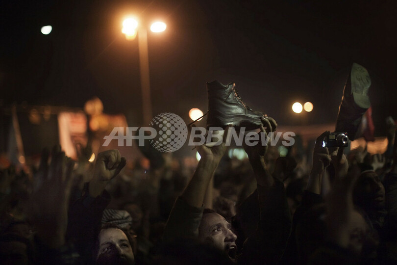 写真は、靴をかかげてムバラク大統領への怒りを示すデモ参加者(2011年2月10日撮影)。(c)AFP/MARCO LONGARI