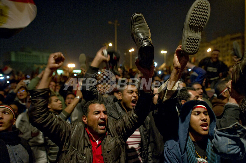写真は、靴をかかげてムバラク大統領への怒りを示すデモ参加者(2011年2月10日撮影)。(c)AFP/PEDRO UGARTE