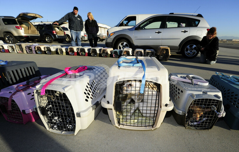【2月12日 AFP】米カリフォルニア(California)州ロングビーチ(Long Beach)の空港から11日、チワワなど小型犬58匹がカナダ・エドモントン(Edmonton)へ向けて飛び立った。この58匹はすべて保護された捨て犬たち。動物愛護団体「spcaLA(Society for the Prevention of Cruelty to Animals Los Angeles)」の「エア・チワワ(Air Chihuahua)プログラム」の一環として、動物愛護団体「オレンジドッグ(Orange Dog Inc)」が用意したプライベートジェットでカナダの里親の元へ向かった。「フリーダム・フライト(Freedom Flight)」と名付けられたこの活動では、カリフォルニア州南部で飼い主に捨てられた犬たちと北米の里親とのマッチングを行っている。(c)AFP