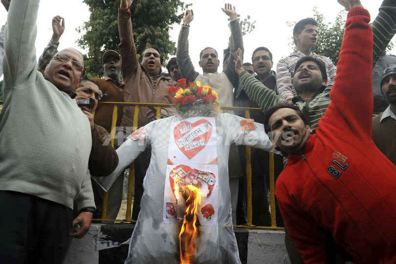 ニュース ライフ バレンタインを祝うなど許さん!ヒンズー教強硬派が猛抗議 2011年2月14日 12:08 発信地:アムリツァル/インド [ アジア・オセアニア インド ] このニュースをシェア ‹ › ❮ 3/10 ❯ インド北部アムリツァル(Amritsar)で13日、ヒンズー教至上主義を掲げる政党「シブセナ(Shiv Sena)」の活動家らが、バレンタインデーを糾弾するデモを行った。シブセナは、バレンタインデーはヒンズー教の生活慣習を脅かす文化侵略だと激しく反対しており、バレンタインデーカードを燃やしたり、店舗で販売されている関連商品を破壊するなどした。写真は、バレンタインデーに見立てた人形を燃やして気勢をあげるシブセナのメンバーら(2011年2月13日撮影)。(c)AFP/ NARINDER NANU 画像作成中 ! 【2月14日 AFP】インド北部アムリツァル(Amritsar)で13日、ヒンズー教至上主義を掲げる政党「シブセナ(Shiv Sena)」の活動家らが、バレンタインデーを糾弾するデモを行った。シブセナは、バレンタインデーはヒンズー教の生活慣習を脅かす文化侵略だと激しく反対しており、バレンタインデーカードを燃やしたり、店舗で販売されている関連商品を破壊するなどした。(c)AFP ライフ 一覧へ> メディア・報道関係・法人の方向け 写真・動画 購入のお問合せ>