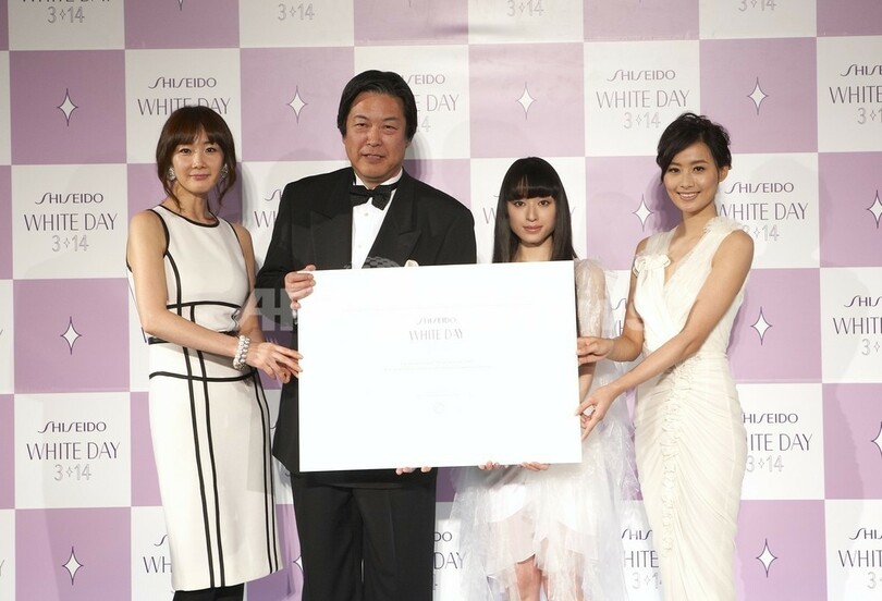 長年「美白」を研究し続け、アジアの女性を美しくすることをモットーに製品を開発、発表している資生堂が、“美白”と“北海道の真っ白な雪”を紐付け、開催に至った今回のイベント。この日、会場には資生堂インターナショナルの美白製品「ホワイトルーセント(WHITE LUCENT)」のグローバルキャンペーンモデルにも起用されている女優の栗山千明、韓国からはチェ・ジウ(Choi Ji-Woo)、中国・香港からは女優のファラ・チェン(Fala Chen)が美白大使として登場。一面銀世界のモエレ沼公園を会場に、真っ白なドレス姿で登場した3人はまるで雪の妖精のようだ。アジア人女性の美と健康、さらには美白活動の促進とPRのために3人は「美白宣言書」サインをした。(c)MODE PRESS