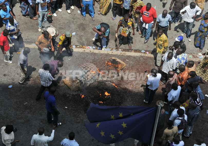 【2月18日 AFP】大統領選の結果をめぐり「2人の大統領」が就任するなど政治の混迷が続くコートジボワールで17日、カカオ農家が首都アビジャン(Abidjan)の欧州連合(EU)事務所前で大量のカカオ豆を燃やす抗議デモを行った。