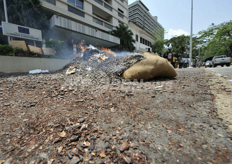 【2月18日 AFP】大統領選の結果をめぐり「2人の大統領」が就任するなど政治の混迷が続くコートジボワールで17日、カカオ農家が首都アビジャン(Abidjan)の欧州連合(EU)事務所前で大量のカカオ豆を燃やす抗議デモを行った。