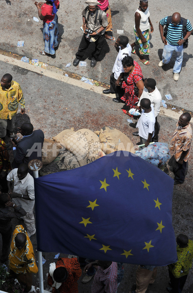 【2月18日 AFP】大統領選の結果をめぐり「2人の大統領」が就任するなど政治の混迷が続くコートジボワールで17日、カカオ農家が首都アビジャン(Abidjan)の欧州連合(EU)事務所前で大量のカカオ豆を燃やす抗議デモを行った。