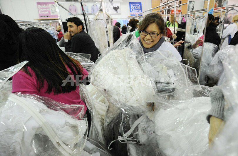 写真はセール品の中から見つ出したお気に入りのウエディングドレスを抱えて通路を急ぐ女性(2011年2月18日撮影)。(c)AFP/Stan HONDA