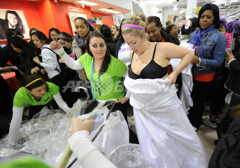 【2月20日 AFP】ニューヨーク(New York)のデパート、フィリーンズベースメント(Filene's Basement)で18日、毎年恒例のウエディングドレスのセール「Running of the Brides(花嫁ダッシュ)」が開かれた。同セールでは、定価の数分の1の価格で、デザイナーブランドのウエディングドレスを買うことができる。(c)AFP