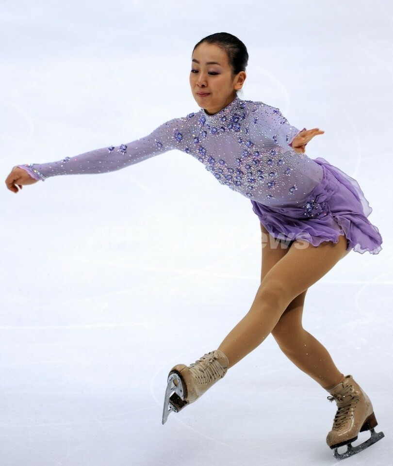 台湾・台北(Taipei)で20日、フィギュアスケート四大陸選手権(ISU Four Continents Figure Skating Championships 2011)の女子シングル・フリースケーティング(FS)が行われ、SP1位の安藤美姫(Miki Ando)が合計201.34点で優勝した。2位は浅田真央(Mao Asada、写真)、3位は米国の長洲未来(Mirai Nagasu)、鈴木明子(Akiko Suzuki)は7位だった(2011年2月20日撮影)。(c)AFP/Sam YEH