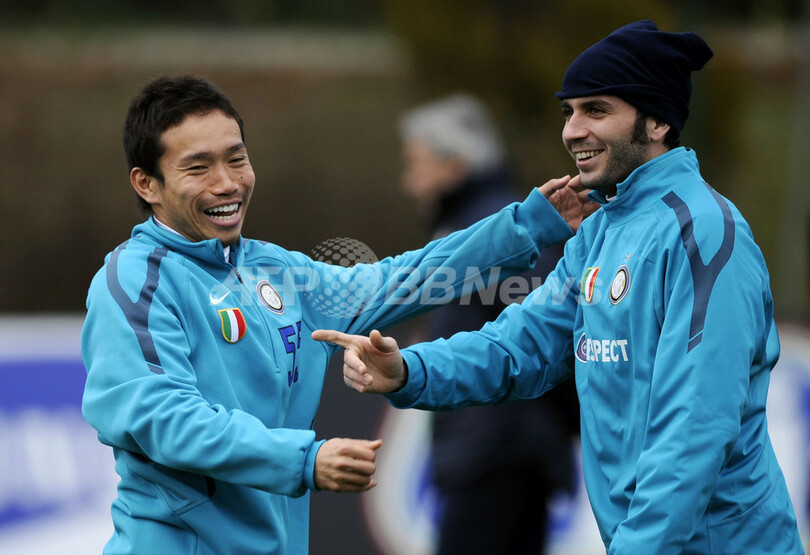 欧州チャンピオンズリーグ2010-11(%%UEFA Champions League 2010-11%%)決勝トーナメント1回戦。バイエルン・ミュンヘン(%%Bayern Munich%%)との第1戦を23日に控えるインテル(%%Inter Milan%%)は22日、クラブの練習場アッピアーノ・ジェンティーレ(%%Appiano Gentile%%)で最終調整を行った。写真はジャンパオロ・パッツィーニ(%%Giampaolo Pazzini%%、右)と笑顔で言葉を交わす長友佑都(%%Yuto Nagatomo%%、2011年2月22日撮影)。(c)AFP/OLIVIER MORIN