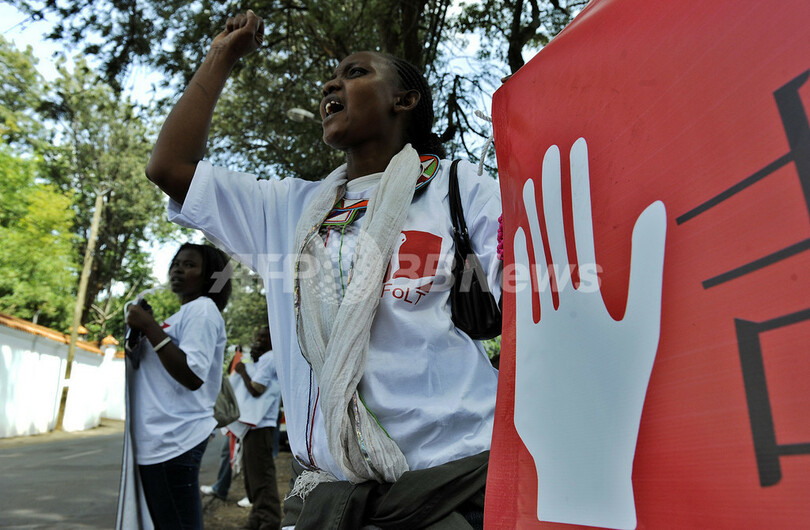 写真は、ケニア・ナイロビ(Nairobi)の中国大使館前でデモを行うケニアの環境保護団体「フレンズ・オブ・レイク・トゥルカナ(Friends of Lake Turkana)」(2011年2月20日撮影)。(c)AFP/Tony KARUMBA