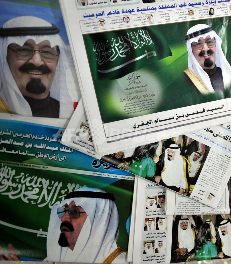 アラビア半島ではバーレーンやイエメンなどが反体制デモのただ中にある。同日の国内紙はすべて、第1面をリビア情勢ではなく国王帰国のニュースで飾った。英字紙アラブ・ニューズ(Arab News)は「国王は地域安定の唯一の支柱」と伝えている。(c)AFP/Omar Hasan