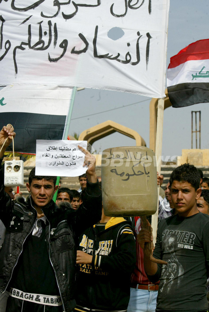 イラク政府はデモを阻止するため、議員の報酬削減や、困窮世帯への食料援助予算の増額、輸入品の値上がりにつながる輸入関税増税の延期などの施策を導入している。マリキ首相は、25日のデモを組織したとして国際テロ組織アルカイダ(Al-Qaeda)や、サダム・フセイン(Saddam Hussein)元大統領の支持者らを非難した。(c)AFP/Sammy Ketz