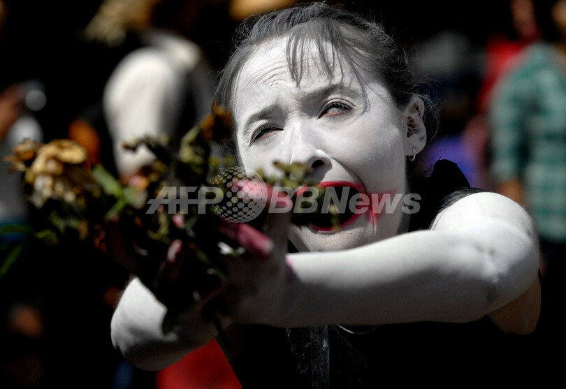 写真は、震源に近いコンセプシオン(Concepcion)で、復興の遅れをめぐって政府を批判するデモでパフォーマンスをみせる被災者の女性(2011年2月26日撮影)。(c)AFP/ARIEL MARINKOVIC
