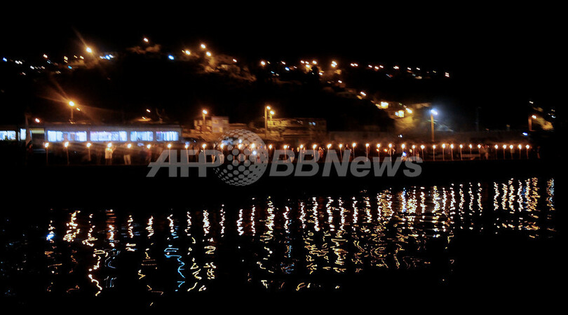 写真は、津波で被害を受けたタルカワノ(Talcahuano)で、「海との再会(reunion with the sea)」と題された追悼イベントで同地の犠牲者37人のためにともされた37本のたいまつ(2011年2月27日撮影)。(c)AFP/Ariel Marinkovic