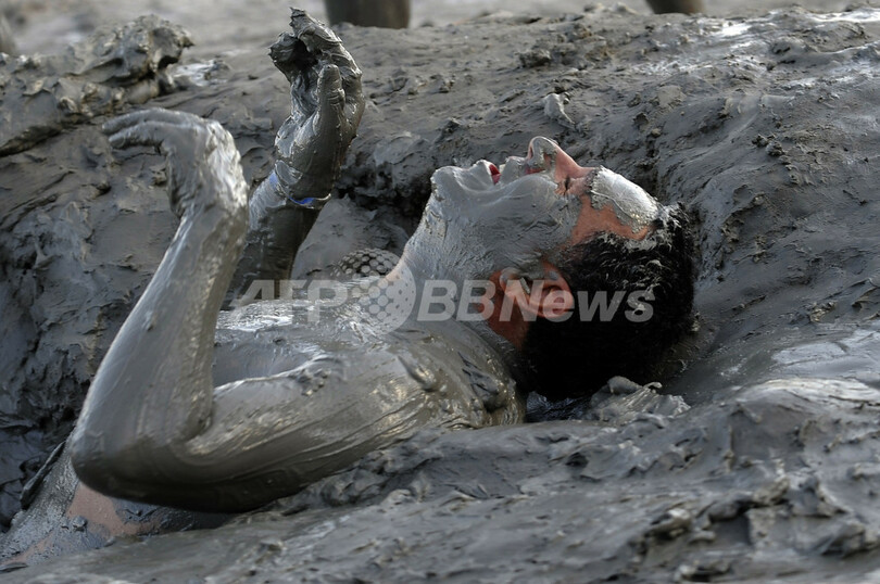 写真は、死海(Dead Sea)のほとりで、ミネラルが豊富だという死海の泥の中に身を横たえるチリ鉱山の作業員(2011年2月27日撮影)。(c)AFP/DAVID BUIMOVITCH