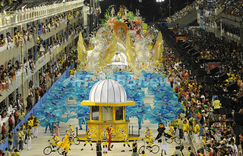 【3月7日 AFP】南米ブラジルのリオデジャネイロ(Rio de Janeiro)で6日に開幕したカーニバルは同日夜から、様々なサンバチームが壮大な山車の上で華やかな衣装や踊りを競うコンテストが始まった。コンテスト会場のスタジアムでは、観衆7万人が見守るなか、2夜にわたってサンバコンテストが繰り広げられる。盛大なコンテストの映像は世界にも配信される。(c)AFP