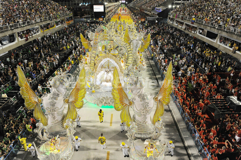 【3月7日 AFP】南米ブラジルのリオデジャネイロ(Rio de Janeiro)で6日に開幕したカーニバルは同日夜から、様々なサンバチームが壮大な山車の上で華やかな衣装や踊りを競うコンテストが始まった。コンテスト会場のスタジアムでは、観衆7万人が見守るなか、2夜にわたってサンバコンテストが繰り広げられる。盛大なコンテストの映像は世界にも配信される。(c)AFP